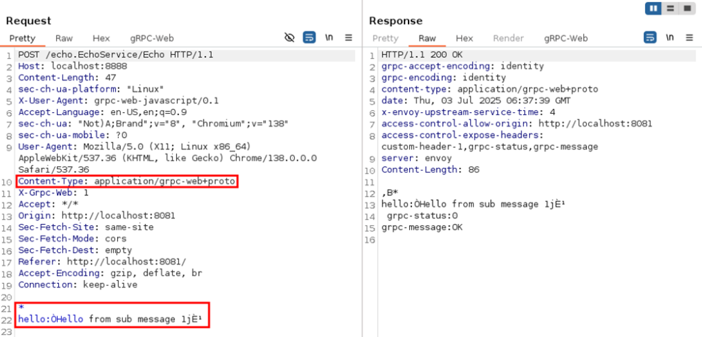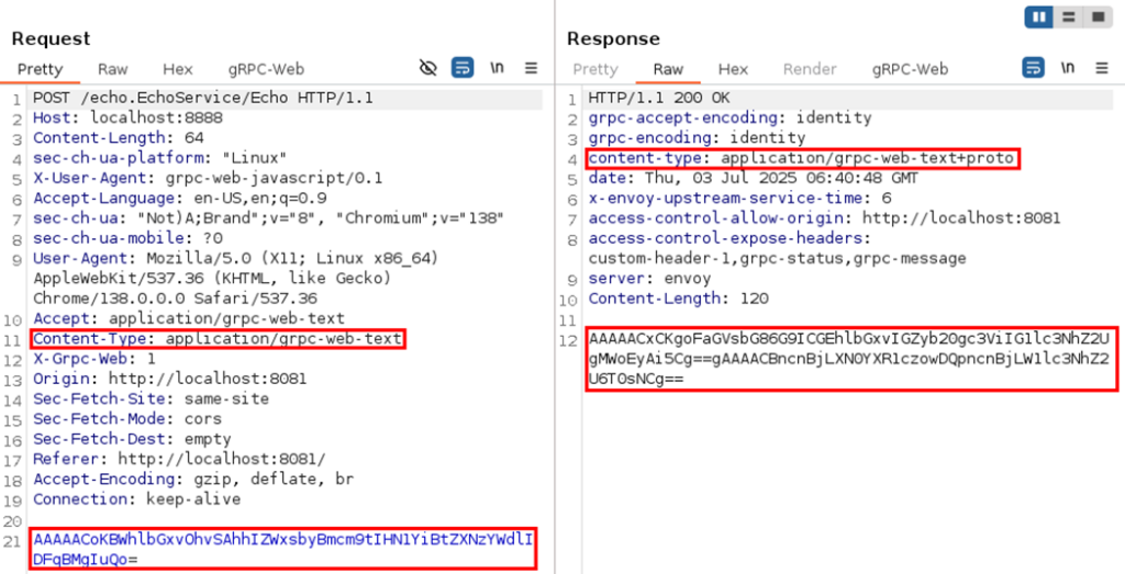 The gRPC framework, and by extension gRPC-Web, is based on Protocol Buffers (Protobuf), a binary data serialization format that is more efficient in terms of both speed and size than JSON or XML. However, this binary data format is not human-readable. Depending on the encoding mode used, either a raw binary blob or a Base64-encoded version thereof is sent in the request and response body. This poses a challenge for penetration testers when intercepting browser to server communication with tools such as Burp Suite.