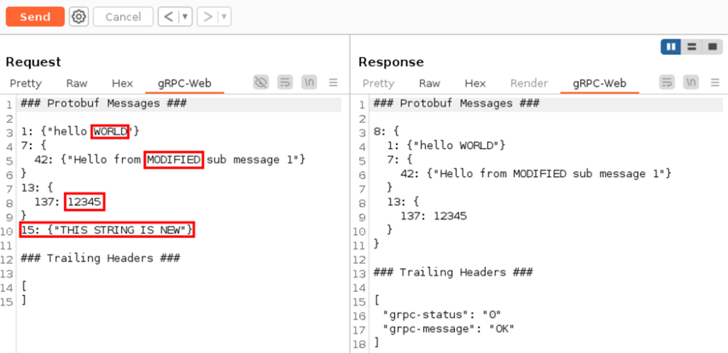 The gRPC-Web tab is also available in Repeater. Any part of the decoded request or response can be modified. In addition to editing fields, it is also possible to add or remove fields: