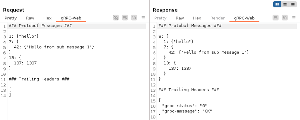 The gRPC framework, and by extension gRPC-Web, is based on Protocol Buffers (Protobuf), a binary data serialization format that is more efficient in terms of both speed and size than JSON or XML. However, this binary data format is not human-readable. Depending on the encoding mode used, either a raw binary blob or a Base64-encoded version thereof is sent in the request and response body. This poses a challenge for penetration testers when intercepting browser to server communication with tools such as Burp Suite.