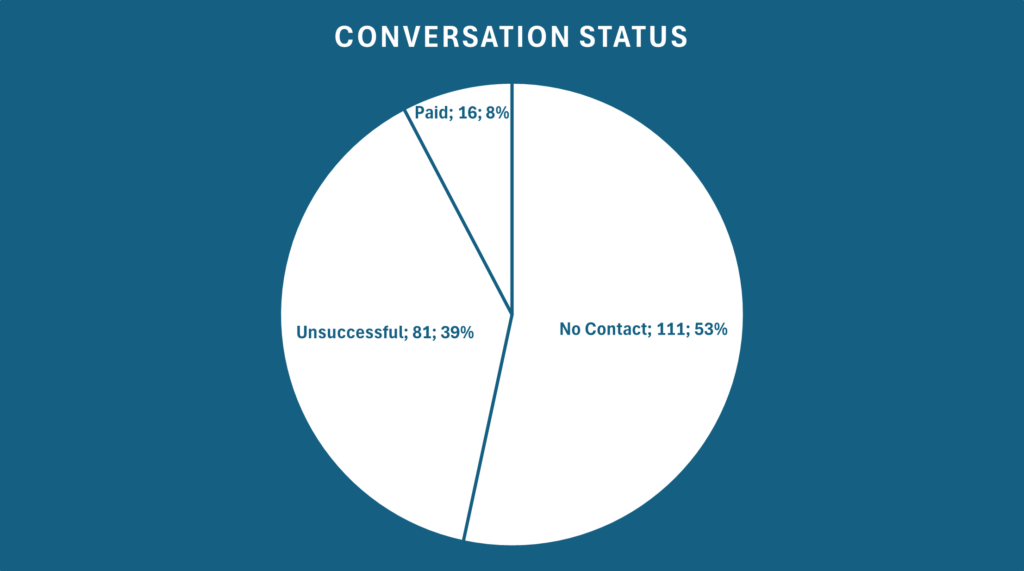 The leak contained in total 208 ransomware chats from December 18, 2024 to May 29, 2025, totaling 4423 messages. Out of those 208 conversations, 16 resulted in a payment, around 8%. Of the 97 chats in which the victim contacted the attackers at all, 17% resulted in a ransom payment.