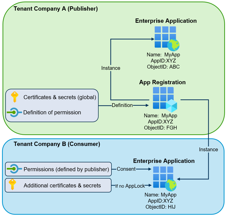 - Present on the globally unique app registration object in the publisher’s tenant. These credentials allow authentication in every tenant worldwide where the corresponding enterprise application exists.