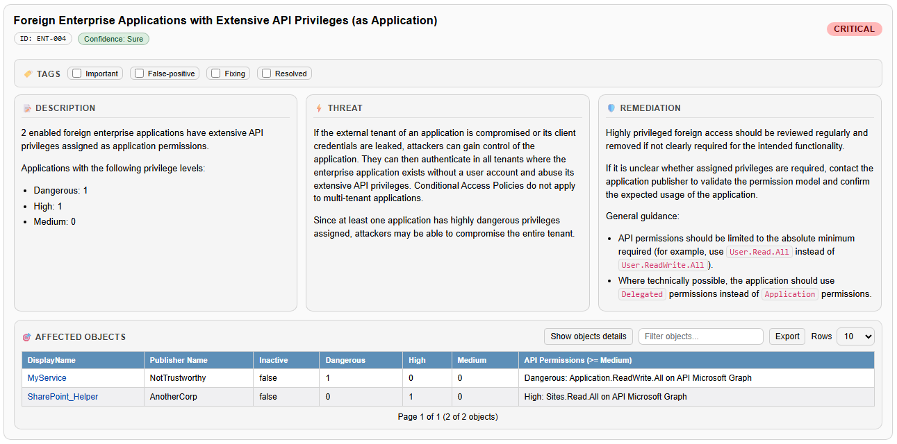 The Affected Objects section lists all foreign enterprise applications identified by the finding, including their assigned API permissions and related context. Clicking on the name of an affected object opens the detailed enterprise application view directly within the HTML report.
