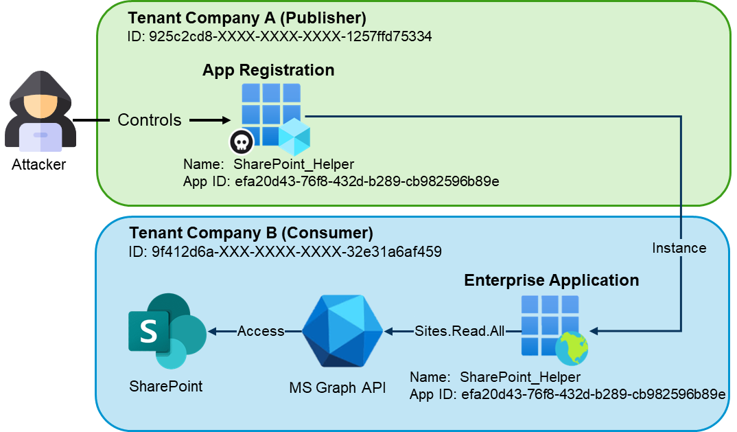 Since the credentials for the application are controlled in the external tenant, they lie outside the direct control of the consumer organization. If the external tenant is not properly secured or monitored, attackers might be able to steal existing credentials or add new ones and then authenticate as the application in other tenants where the enterprise application is present.