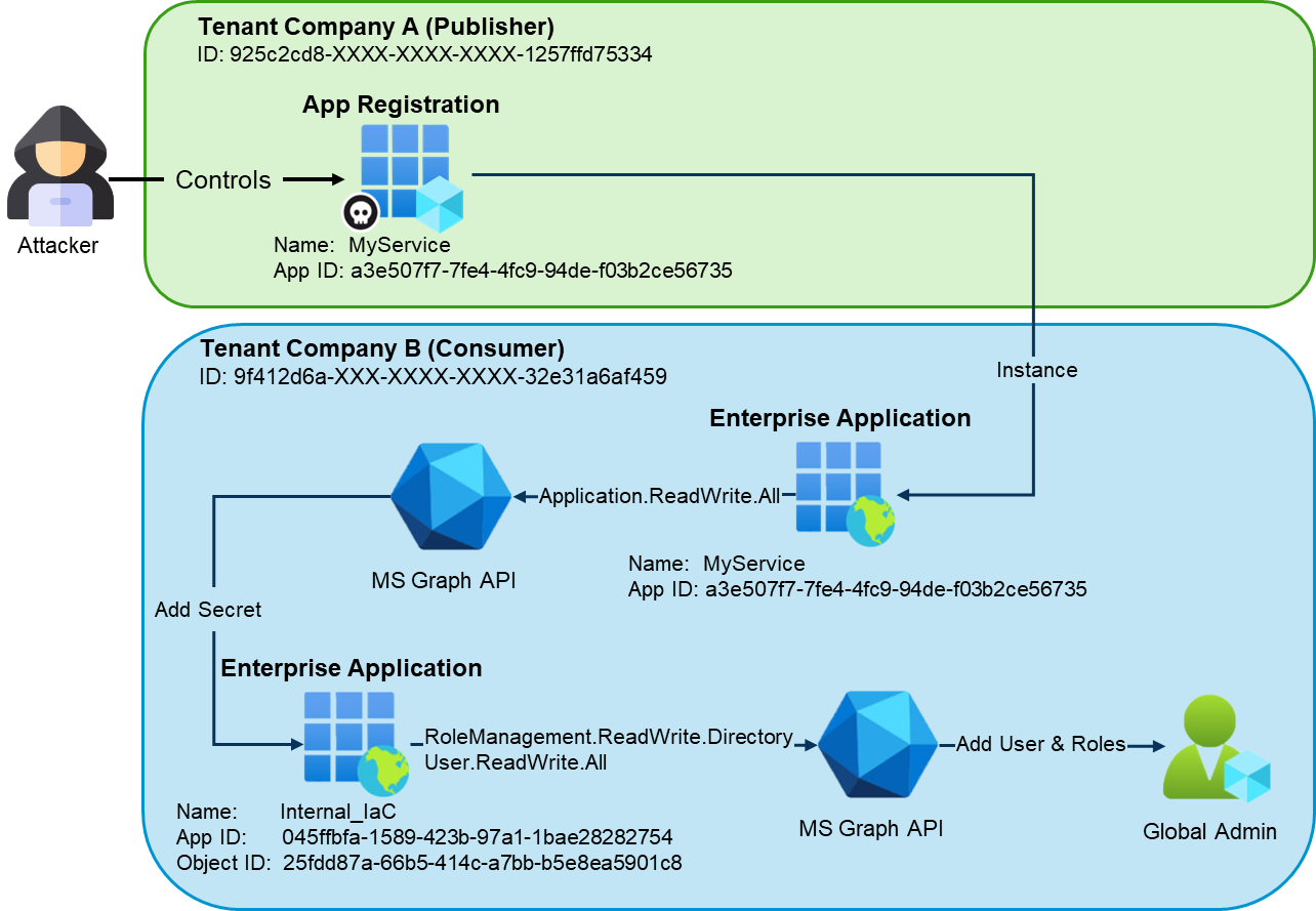 The second example demonstrates how a foreign enterprise application with dangerous application permissions can be used as an entry point to compromise internal enterprise applications with more extensive privileges.